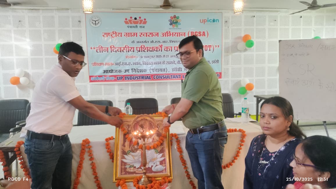 झांसी। राष्ट्रीय ग्राम स्वराज अभियान के अंतर्गत उपनिदेशक पंचायत झांसी मंडल के तत्वाधान में ग्राम पंचायतों के स्वयं के आय स्रोत विषय पर तीन दिवसीय (दिनांक 25 अक्टूबर से 27 अक्टूबर 2025 तक) प्रशिक्षकों का प्रशिक्षण आई एम ए भवन में आयोजित किया गया, जिसका शुभारंभ उपनिदेशक पंचायत झांसी मंडल अजय आनंद सरोज एवं जिला पंचायत राज अधिकारी डॉ बालगोविंद श्रीवास्तव द्वारा मां सरस्वती के चित्र पर माल्यार्पण एवं दीप प्रज्वलन के द्वारा किया गया।